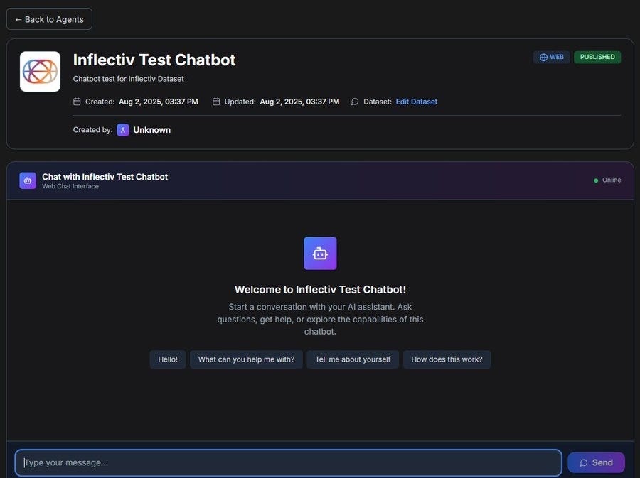 Use this interface to test your bot’s knowledge, logic, or tone before deploying it more widely (e.g., embedding on your site).