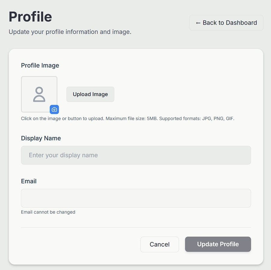 After entering your details, click Update Profile to save your changes. You can always return to the Dashboard using the Back to Dashboard button at the top.